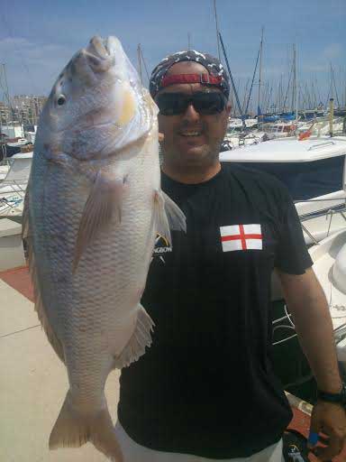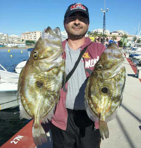 Fue pescado en unos 50 m. de sonda, igual que la dorada de cerca del kilo que presenta. Ésta ultima fue clavada utilizando lombriz tita de cebo, y el gallo Pedro con langostino