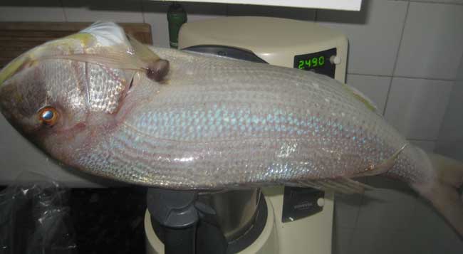 | Bajo, pagel, que segun el interesado, pesó 2,700 y unas buenas chopas . A la derecha dos gallos capturados recientemente |