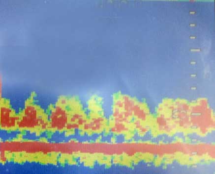 En esta ocasión, pese a tener las doradas comiendo debajo del barco, sin parar, supimos decir basta. Incluyo, bajo, nuestras capturas y el aspecto tan significativo de la sonda: La imagen sugería que "eran ellas" y algo de vegetación, pues apenas teníamos morralla. |