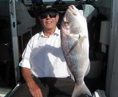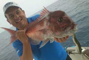 Arriba, Juan Manuel con una sama ( Dentex Gibosus) pescada al jigging, a embarcacion a la deriva o al ralentí.Vea las diferencias entre su pariente próximo el dentón o dentex dentex y la sama. Pulse aquí