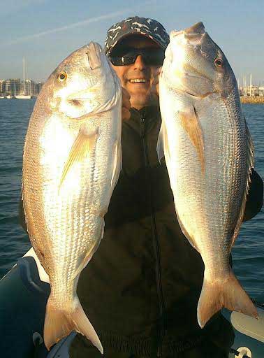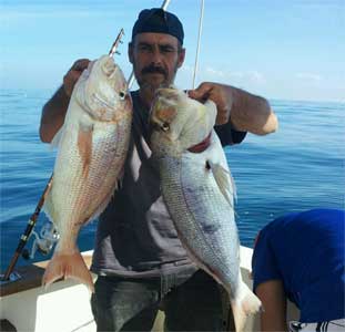 Pagel de dos kg y denton de 3, pescados recientemente a bordo de la embarcación Mis Nenas