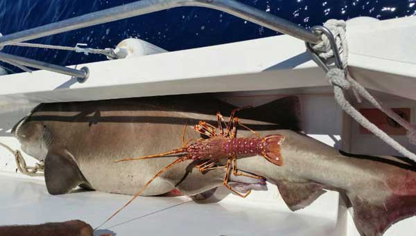 Curiosa imagen de una langosta( la segunda que consiguieron en pocos días) y la cañabota Pulsen imágen para ampliar |