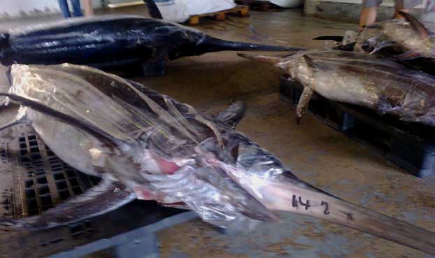 A la izquierda, 4 peces espadas capturados el dia 7 de julio por un palangrero local, de los cuales uno pesó 142 kg y otro 130 . El pez espada (Xyphias gladius), puede alcanzar los 6 metros ( de los cuales, 2 , es decir la tercera parte corresponderían a su espada). y mas de 500 kg de peso. Pero lo corriente es que en nuestras aguas no alcancen estos pesos .