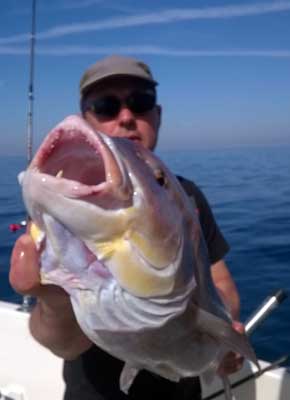 | Un buen palometon de 10 kg logrado enesta enbarcacion, pescada al curri con cebo natural Esta vez al parecer con caballas o estorninos ENHORABUENA MAESTROS. (Esta es la 4ª captura en lo que va de mes) |