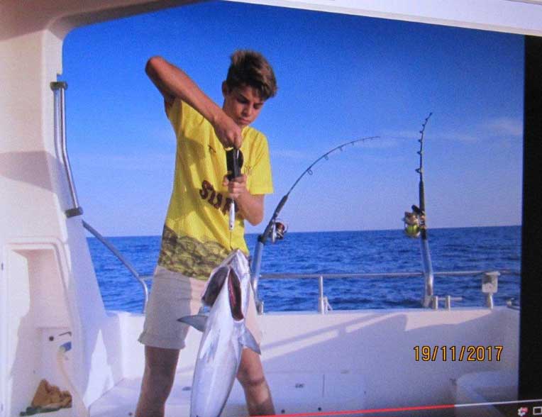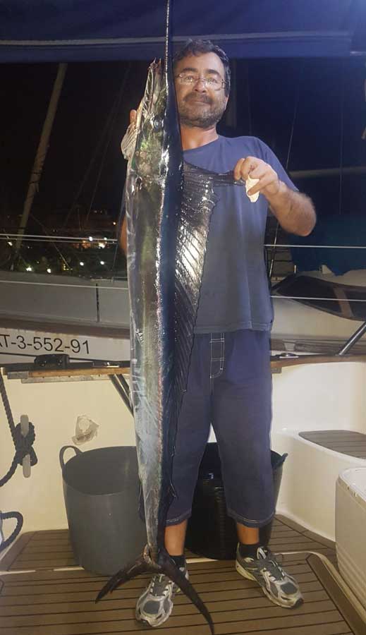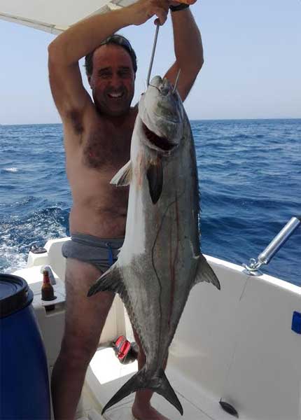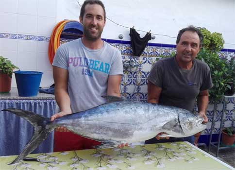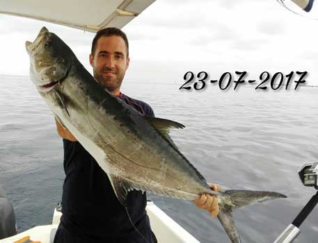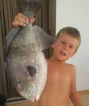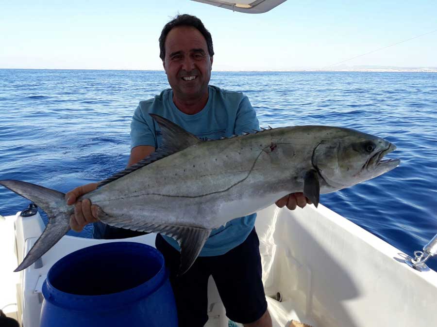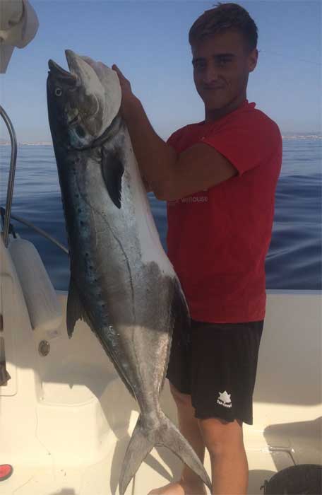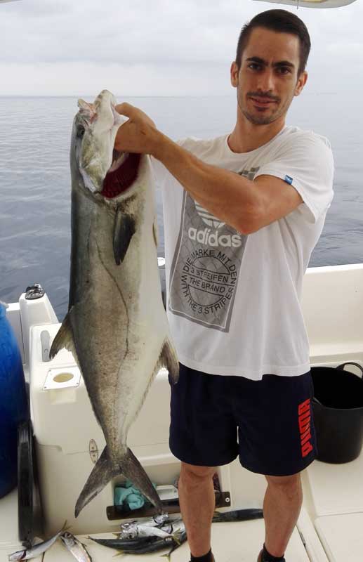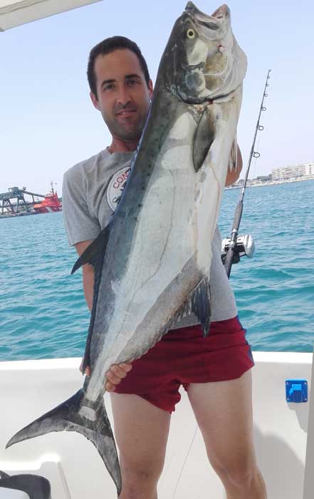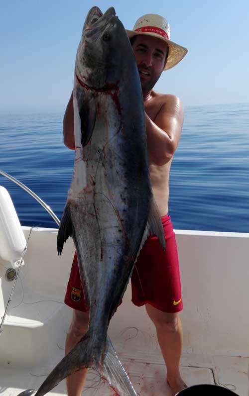 El sabado 24 capturaron otro palometóm. Esta vez pesó 14 kilos, pescando al curricán de fondo, con cebo vivo, en 35 metros de sonda. En esta otra ocasión iban a bordo su padre, Antonio, y Sergio y Marco.