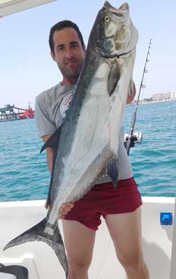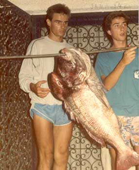 | Este gran palometón ( lichia amia) de 20 kg , fue capturado ayer dia 22 de junio por estos grandes pescadores, dueños de esta embarcación que tiene sus nombres, pescando al currican de fondo, en 35 m, de sonda . Pulse imágenes para ampliar |