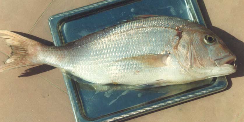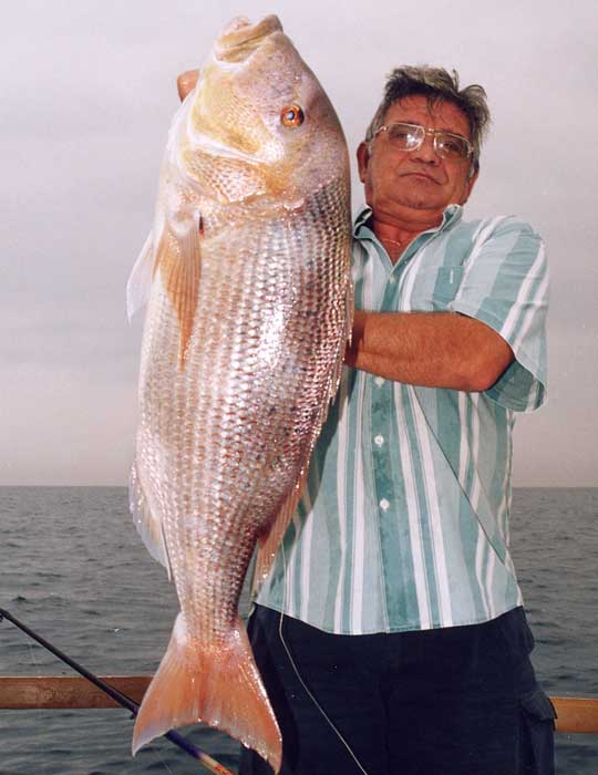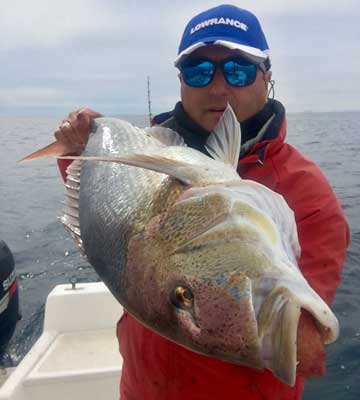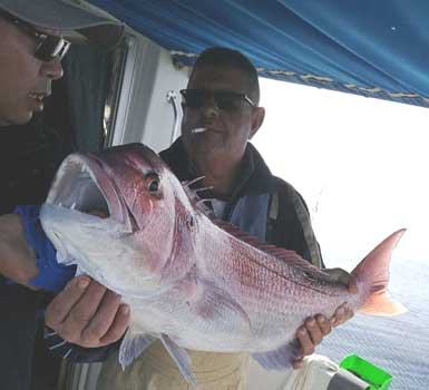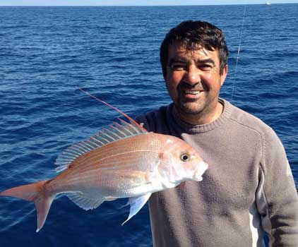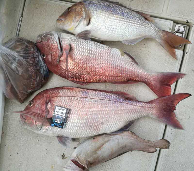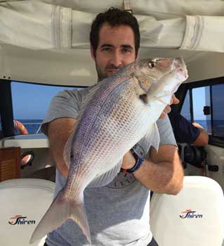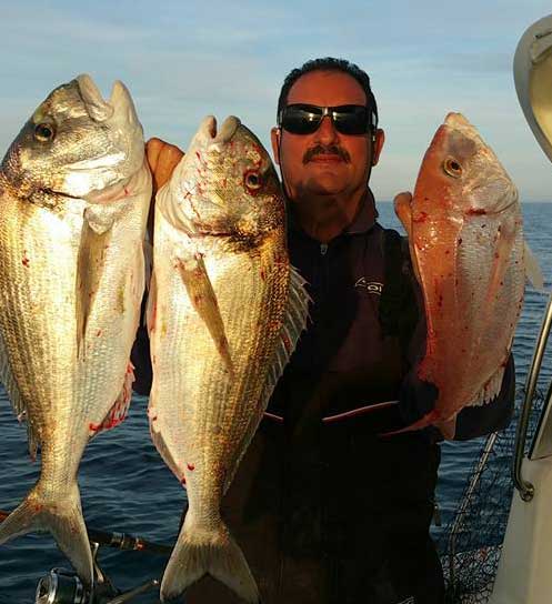 Arriba a la izquierda, sama marroquí o dentex marocanus.Parece un pagel pero sus dientes incisivos son caniniformes .Es muy raro y fue capturado por Federico Javaloy