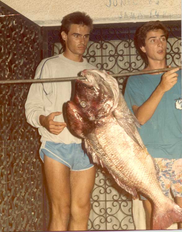 A la izquierda, arriba, Ignacio Vergel , el patrón con una de las samas A la derecha con la otra y su compañero de ese día. Obsérvese el tamaño de los radios 3º 4º y 5º de la aleta dorsal y el colorido rojizo de esta sama hembra. Como verán bajo en fotos de archivo. las samas juveniles presentan esos mismos radios dorsales ( sobre todo el 3º) muy exagerados,( los dos primeros radios son muy pequeños y no son visibles con claridad en ninguna de las fotos. Pulse imagen para ampliar