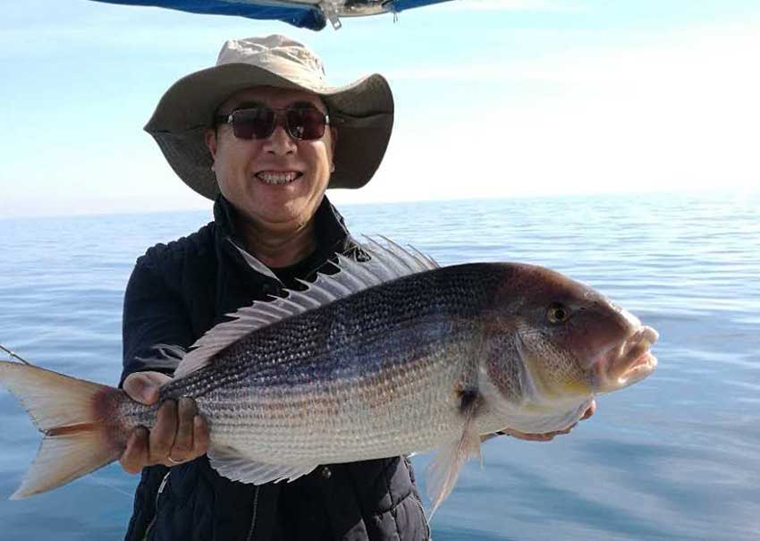 | Bajo otro precioso denton, capturado con cebo vivo en 52 m de sonda , por José Ferrandez, de Almoradí, hijo de un veterano pescador del Club, Jesús, patrón