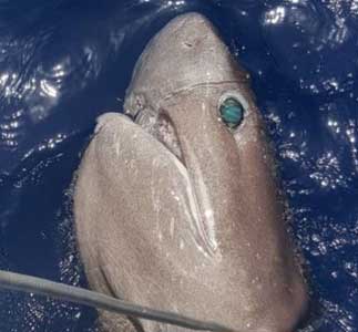 Arriba bonita imagen de fondos con pescado en 300 m de sonda .A la derecha la cabeza de una gran cañabota o tiburon de profundidad. Vea el video con imagenes de su captura. Pulse AQUI