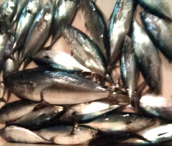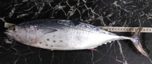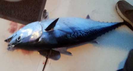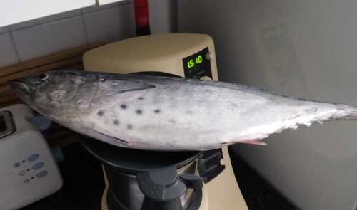 Bacoreta que fue pesada y medida a bordo. En realidad, según Bauchot y Pras, la bacoreta o Euthynnus alletteratus, puede alcanzar una talla de un metro y un peso máximo de 16 kg, pero por lo menos yo, es la primera de esta talla y peso que veo subir a bordo Mi enhorabuena a los dos y especialmente a Vicente que la izó a bordo, trabajosamente y con habilidad, mediante una línea que se le clavaba en los dedos Pulse imágen para ampliar