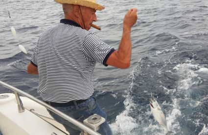| Ariba, Vicente, abatiendo dos buenas bacoretas.Observen los 2 tipos de excitadores que utilizan a distinas distancias del barco y pescando en superficie . En el centro de la popa va otro aparejo que pesca a mas profundidad dotado de un plomo de medio kilo |