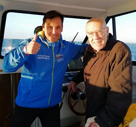 | A la izda J.Martinez, actual dueño del Madroño con otro dentón conseguido días despues de los reportados en la portada .A la derecha el actual patron, con Miguel Cuervo | |
