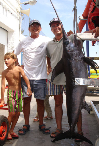 El momento de la pesada. Manolo el Contramaestre dió fe del peso: 34 Kg, Talla ( mandíbula inferior- horquilla caudal 1,40)