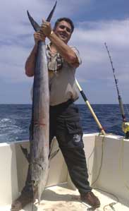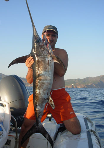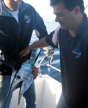 | Primera pesca de altura del presente año de la embarcación Polar.Una aguja imperial de 130 cm., capturada a 350 mts de sonda frente a Valencia, curricaneando a 8 nudos.La pescó con equipo de 50 libras utilizando de señuelo un Halco Láser Pro de 19 cm., color blanco con cabeza roja, pescando a una distancia de la popa de unos 70 mtrs. El combate duró aproximadamente 12 minutos.Fue subida a bordo, fotografiada y devuelta al mar de nuevo , "siendo para mi (en palabras de Antonio Delgado de la Junta de Pesca Responsable de la C. V.) "una de las experiencia en la pesca mas bonita de mi vida". |