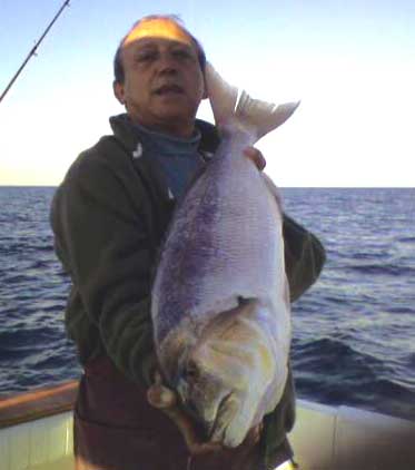 Una gran pesquera hecha a bordo del "Toni dos" el 15 de Sept.08 en 450 m. de sonda. Los besugos eran todos de peso cercano al kilo (y la mayoría de alrededor de los dos kilos) como se puede comprobar en alguna de las fotos abajo insertada. Junto a ellos dos chernas , la mayor de las cuales pesó 40 kg. Se cogió ademas un pez llamado en Torrevieja "Besugo imperial" que desde luego no es de la familia de los espáridos. Reproduzco una foto bajo, enviada por Eduardo, otro de los protagonistas de la pesquera, de un gran ejemplar de esa especie perteneciente a la familia de los centrolophidos, (peces que como la cherna viven primero en aguas superficiales y luego alcanza profundidades hasta de 1 . Pulse las imágenes para ampliar |