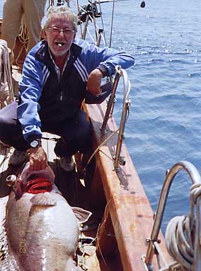 ![]() Antimo Mateo con una cherna que pesó aproximadamente 45 kg, pescada a bordo de un motovelero yendo a bordo los conocidos y grandes pescadores Pepe Alcaraz y Joaquin Leal, pescando con cebo vivo ( besugos y pollos) en 500 m. de sonda. |