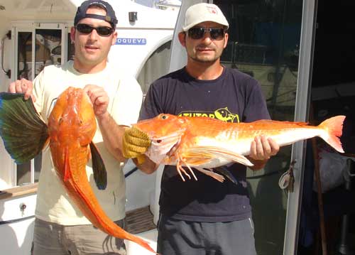 ![]() Chirriolas o o bejeles ( Trigla lucerna) de 4 ,2 kg y 5 kg. Esta última fue medida y pesada personalmente por mi y tenía 81 cm cuando lo descrito por Bauchot y Pras es de 75 cm para 6 kilos como máximo. La he incluido como nuevo record computado del Club( aunque en Torrevieja se llegó a capturar otra de mayor peso) Fue pescada a bordo del Avizor en 100 m. de sonda utilizado trozos de besugo El anterior recor del Club lo tenía precisamante su compañero de barco ese día, Manolo Ruiz con uno de 4 kilos |
