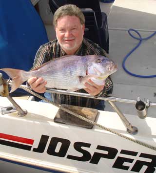Este año sea al curricán de fondo, a jigging sea ocasionalmente pescando con volantin, usando cebo vivo o trozos de sardina o alacha, se están capturando en aguas próximas a Torrevieja, numerosos dentones.Uno de ellos, de 3,5 kg y 63 cm de talla, fué pescado a mediados de abril, por J.M. Medina a bordo del "Avizor".Tuve la ocasión de participar en la emoción de la habilidosa captura de este hermoso y bravo ejemplar pescado a fondo en 40 m. de sonda con caña fina y teminal del 0,40 de fluorocarbono. Ver bajo algunas imágenes de la misma |