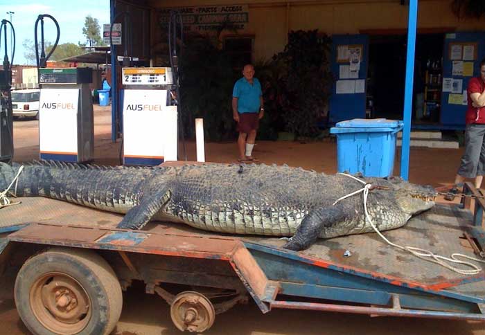 " este gran lagarto empezó a atemorizar a un pescador de Barramundi comiéndose la helice de su fueraborda. Fue dándole vueltas a su bote de aluminio de 5 metros durante 20 minutos antes de que se decidieran a matarlo el y su espantado acompañante" |