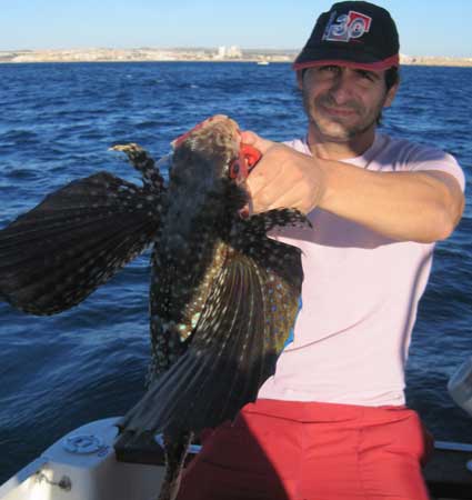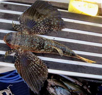 Tiene dos aletas dorsales , la primera con seis radios duros , los dos primeros sueltos. Aletas pectorales divididas en dos partes, la delantera pequeña, con seis radios, la de detrás muy larga, casi hasta la aleta caudal. Coloración marrón rojiza por el dorso, blanquecina por el vientre; aletas pectorales verdoso azulado, con manchas redondas negras y claras y puntitos azules.Mide hasta 50 cm de longitud. Es de carne muy apreciada. En algunos sitios se conoce como volador, por que se pensaba al ver sus alas que podía hacerlo. Emite un gruñido o ronquido carácterístico |