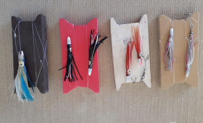 | Cerca del segundo punto señalado en el Gps, la caña de estribor se dobló mucho más que antes, hacia popa. En este momento el barco llevaba una velocidad de 7 nudos y esta vez la bacoreta era de un kilo por lo menos. Continué navegando hacia un tercer punto, con fondo rocoso y abrupto, marcado en el gps. Al poco, ví saltar a poca distancia de los excitadores, un pescado que identifiqué como llampuga. |