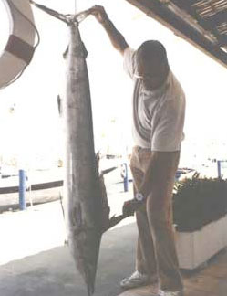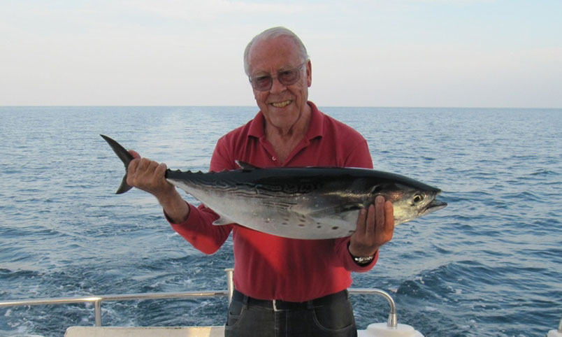 Miguel Cuervo, veterano y gran pescador de 83 años, pero en plena forma y con la ilusión por la pesca en toda su larga vida, nos cuenta su última aventura Arriba, el autor del articulo que (pueden ver a continuación), con una gran bacoreta lograda en otra ocasión Pulse imágenes para ampliar |