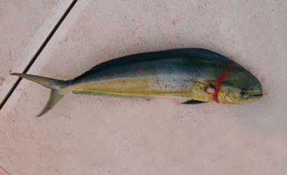 El viento, en este momento soplaba de costado. Era incómodo y con más fuerza de la que anunciaba el parte. Viré lentamente de 20 en 20 grados, y al llegar a los 180 grados tenía nuevamente el pesquero por la proa. Lo sobrepasé y esta vez no hubo picada. Avancé unos cien metros mas… ¡y de pronto las dos cañas como dos arcos…! Me dediqué primero a la de babor bombeando y poco a poco me llegó el excitador, lo levanté a tope y una bonita llampuga apareció, exhibiendo su precioso colorido. La metí en la nevera, dejé la caña en su cañero y fuí por la siguiente |