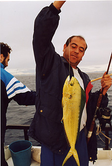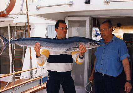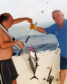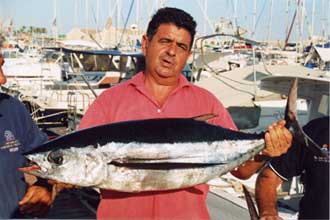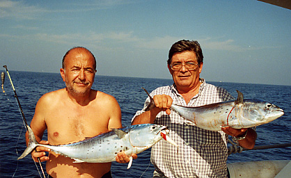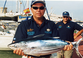 La albacora es el otro representante en aguas mediterráneas del género Thunnus ya que el otro representante, el T.Obesus o patudo, no existe en nuestras aguas, aunque si en la costa ibérica atlántica y en Canarias. El carácter diferencial mas importante es que las aletas pectorales son muy largas( tambien se le llama Germo Alalunga). Tiene una nítida separación entre el azul oscuro del dorso y el plateado del costado y vientre ,mostrando, en la zona de separación, una estrecha franja azul iridiscente. Se captura de ordinario mas allá de la plataforma continental en torno al "Seco" o en veriles de 1000 m. Entra a la bonita, a rapalas y konahead de cabezas metalicas y faldones de plumas o vinilo. Parece que le tientan mas lo colores blanco y rojo aunque también los azul y violeta. Alcanza un tamaño de 1,20 y 30 kg de peso. El que presento es el máximo capturado entre nosotros, que pesó 24,300 LISTADO o bonito de altura
