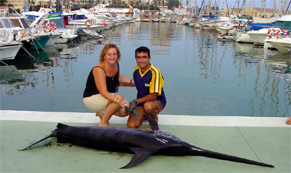 Tambíén se capturan durante la noche con señuelos normales, precedidos de ampolla lumínica pescando al curri lento, y con profundizador. Los mas grandes han sido conseguidos de día en aguas peruanas, cebando el anzuelo con enormes calamares recién capturados. El récord mundial está en 536 kg. Aguja imperial, o marlin mediterráneo (Tetrapturus belone)