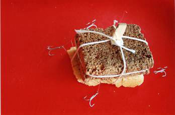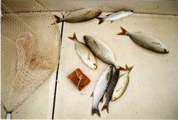 Pescas tradicionales en Torrevieja. La pesca con panetas Algunos torrevejenses, como Jesús Villena o “el tío Carral” practicaban esta curiosa modalidad de pesca, y de ellos aprendí su técnica. Se hacía desde los botes a remo, dentro de la bahía, y resultaba realmente divertida. Las panetas eran trozos de corcho redondeados o cuadrados de unos 10 cm de lado, en cuya cara inferior atábamos una cáscara de melón o una corteza de pan. En dicho flotador iban ligadas (con hilo atado fuertemente a su alrededor), camadas finas de 5 o 6 cm de largo, provistas de pequeñas poteras o anzuelos en los que se ponían trocitos de pan. Aunque las poteras no se cebaran, las salpas se enganchaban en ellas al subir a mordisquear el pan sujeto a las panetas. Las violentas sacudidas del pescado para desprender la comida provocaban el clavado.