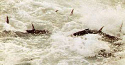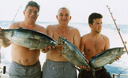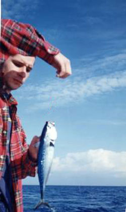 Acercábamos entonces el barco lentamente hacia la bola de pescado o" garvillo" En la proa o por una amura nos poníamos con un salabre de mango largo y malla fina. Con un poco de habilidad y rapidez capturábamos parte de esa pelota de de sardinitas; especialmente si en ese momento había un ataque de las melvas o atunes al cardúmen, este se " abrigaba", en su pánico, junto al casco del barco. Atrapábamos entonces las sardinillas que podíamos, echándolas a continuación en varios baldes de agua preparados de antemano en cubierta. Entonces era cuando la pesca se volvía verdaderamente apasionante. Utilizando cañas robustas de un par de metros con línea del 0,8 y un buen anzuelo del 3 o 4 /0, pasábamos este un poco por delante del ojo de la sardinilla viva, que se dejándola caer alrededor del resto del cardúmen no capturado. Era entonces cuando surgía como un bólido la melva o el atún, atacando fieramente nuestro pececillo herido arrancando casi, la caña, de nuestras manos. Una y otra vez se repetía esta secuencia mientras nos quedaban sardinas a bordo. En torno a nosotros, en cubierta, pronto hay un alegre redoble de coletazos en medio del entusiasmo de todos los de abordo.