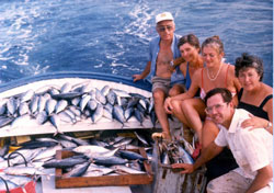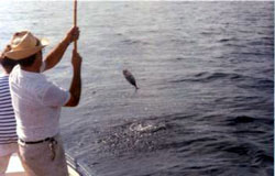 ....A medida que el barco iba navegando, se iban "abrigando", a veces, otros bancos de atunes, con lo que la pesquera podía durar horas. Sucedía a veces que, de un modo inesperado, o coincidiendo con la pérdida de algún atún, el grupo se tornaba indiferente, perdiendo su agresividad. Veíamos ahora bajo del barco, a mas profundidad, sus flancos plateados mas que sus azulados lomos. "Se ponían blancos", según expresión local, y entonces no atacaban. Para despertar de nuevo su agresividad podía dar resultado o fumarse un pitillo dejándolos un rato en paz, o dando una arrancada al barco para hacerlos subir. También era a veces muy eficaz el arrojar agua con una manguera conectada a una bomba, o el más sencillo método de echar agua a pozales para simular pececillos alborotando la superficie del mar, mientras uno de nosotros hacía brincar en superficie consistente el pececito plomado brillante o " porrillo". Al cabo de poco tiempo los atunes se " ponían negros" y agresivos arrancando las cañas de las manos a los más bisoños o rompiendo a veces los sedales con sus ataques fulminantes.
