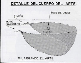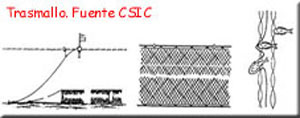 El trasmallo se compone de: relinga superior de corchos, inferior de plomos y 3 mallas de red de hilo fino siendo la dos externas de malla ancha y la interna, que es mas pequeña de luz, queda flácida entre las dos, enredándose el pescado entre ellas. Este arte se cala sobre fondos arenosos o de cascajo. A la derecha desenmallando y estriando el pescado en la dársena del puerto. Texto y fotos A. Javaloy.Esquemas: Publicaciones Excma. Diputación de Almería y del Consejo Superior I. Científicas