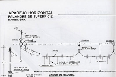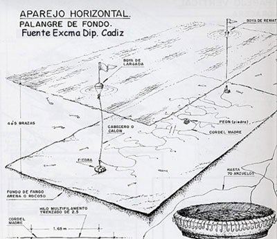 de peces y en el hábitat donde se reproducen. Palangre de fondo Se utiliza de ordinario en fondos rocosos. Se compone de una línea madre y brazoladas con cientos de anzuelos, distribuidos en cestos de unos 70, cuyo tamaño depende de la especie a la que se dedica. Se ceba en nuestra área con trozos de alacha. Hoy día ante la escasez de pesca en zonas antes ricas en peces, como carrilón, piedras de fuera etc, grandes barcos- incluso de otras nacionalidades- calan palangres de fondo para la pesca del sable, besugo y congrios en caladeros situados de 25 a 40 millas de la costa, (“planazo”, seco o el llamado “patíbulo”) Palangre flotante o de deriva