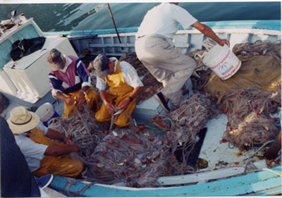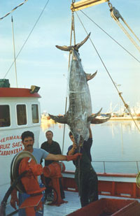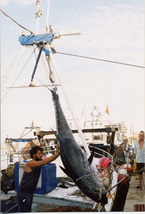 Atún de 180 kg y pez espada de 90, (Año 1996) capturados con palangre flotante a pocas millas de Torrevieja. Trasmallo. En Torrevieja hay 10 embarcaciones menores dedicadas en su mayor parte a la pesca con este arte.