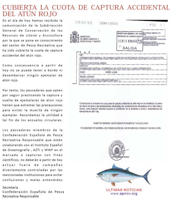 Como es sabido la pesca recreativa del atún rojo, esta prohibida, tolerándose que los barcos recreativos que soliciten acogerse al Anexo III, pidiendo permiso para embarcar atunes enganchados "accidentalemente" y muertos en la lucha , y previa declaración posterior de su captura, puedan traer al puerto un ejemplar con tal que pase de 30 kg. Amplie la noticia |