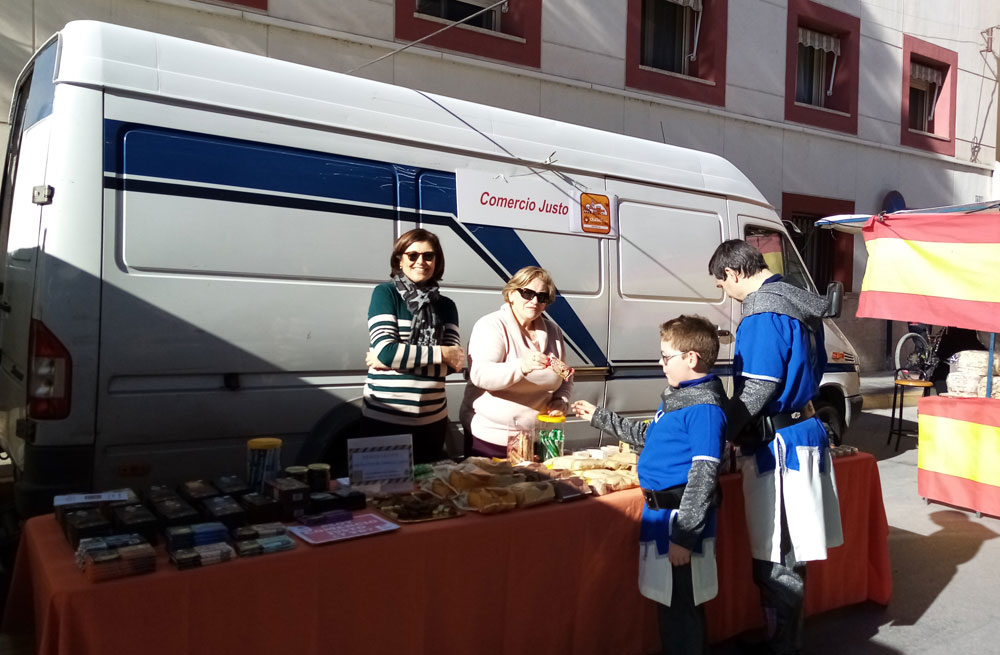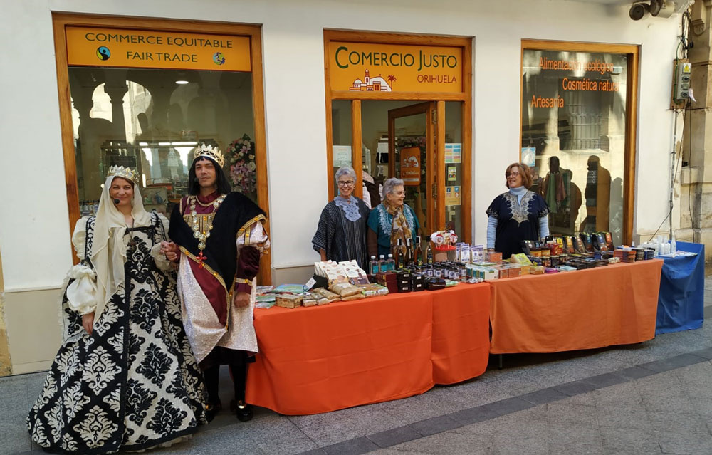 Durante esos 3 dias, nuestros voluntarios atienden un puesto en la misma puerta de nuestra tienda. Lugar que nos reserva el Excmo Ayto de Orihuela, que también subvenciona productos para degustación.La animación en este tradicional Mercado Medieval , que cumple su 22 edición es muy grande , por lo que tenemos multipes ocasiones par sensibilizar a la gente hacia este Comercio Justo.