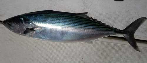 Arriba, Bonito de 1,2 Kg pescado a bordo del Pataty en aguas costeras