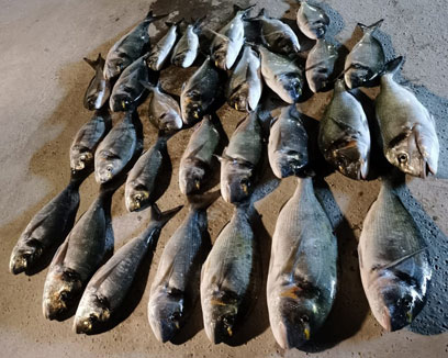 Una buena pesquera de doradas del terreno, logradas por Pepe Medrano y su hijo e invitados. Dos buenos pescadores y amigos