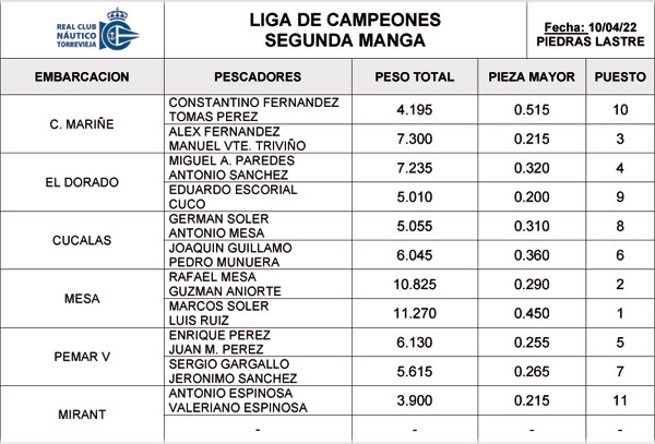 El 10 de abril, se celebró la segunda manga de la llamada Liga de Campeones. Como es sabido esta competición se realiza en varias mangas, a lo largo del año, con objeto de elegir al mejor equipo a presentar en las Competiciones Oficiales Provinciales o Nacionales Participaron 24 pescadores, en equipos de dos, a bordo de 6 embarcaciones . Se dió la salida a las 8 de la mañana, debiendo presentar las capturas antes de las 13 horas. Presidió como Jurado, como es habitual, el Delegado de Pesca Rafael Carmona acompañado del Contramaestre Manolo. Mi agradecimiento a ellos y a la oficinista Lorena, por la remisión del material gráfico Entre los 24 pescadores participantes, presentaron al peso, 75,56 kg de pescado,( a un promedio de 3´43 kg ) conseguidos en su mayoría cerca de la bocana del puerto, en un pesquero llamado las piedras del lastre, llamado así, por ser el sitio cercano a la bahía donde los veleros que venian a cargar sal , arrojaban su lastre de piedra .La pesca fue abundante y variada, como pueden ver a continuacion, llamando la atención, entre otras cosas, el tamaño grande de los raspallones Pulse imagenes para ampliar |