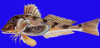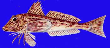 Cuco ( Aspitrigla cuculus).Existe también en el Mediterráneo. Color rojizo con bandas trasversales oscuras. Cabeza con hocico con espinas. Talla hasta 45 cm.
