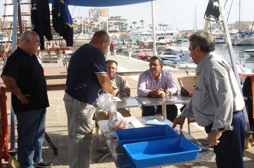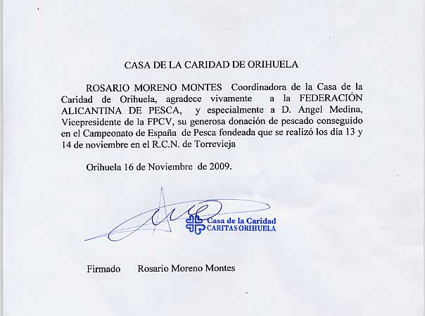 Una vez realizado el control de la tercera manga, las abundantes capturas fueron recogidas por los miembros del equipo arbitral con ayuda del Contramaestre Manolo, para dedicarlas, como es preceptivo en esta clase de eventos, a fines benéficos. En este sentido, quiero agradecer a Angel y Medina así como al resto del equipo, por la deferencia que tuvieron para con la CASA DE LA CARIDAD DE ORIHUELA, cediendo parte del pescado para ayuda de esta entidad, que da albergue y comida diariamente a 11 personas desvalidas y sin hogar. (Carta de agradecimiento)