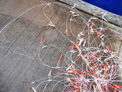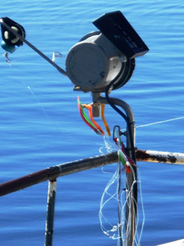 Arriba, barco de pesca industrial de la caballa al curricán. A la derecha aparejo de currican con múltiples anzuelos provistos de tubitos de goma de colores Mas abajo detalle de uno de los carretes electricos ( fotos A. Ramos) |