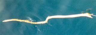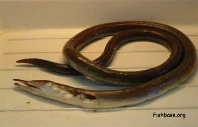 Este raro ejemplar puede llegar a medir 2, 5 m. Tiene unos dientes peligrosos e incluso venenosos en aguas tropicales. Otros ejemplares como este fueron capturados a bordo del Le Mistral en 40 m,.de sonda y un tercero por Salvador Vidal. Son los que aparecen mas abajo Pertenece al género Ophisurus Familia: Ophichthidae Clase: Actinopterygi. Se encuentra en Australia , Nueva Zelanda, Este del Atlántico y en el Mediterraneo occidental Puede vivir en sondas de hasta 300 m. Se le encuentra en fondos fangosos . Bajo otros ejemplares capturados en Torrevieja |
