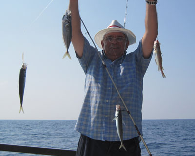 | Bajo, una imagen no muy frecuente. Nomalmente pescamos con aparejos de 3 anzuelos , aunque en sitios en los que abundan caballas o jureles, añadimos un pequeño jig o un excitador de color rojo. La foto está hecha hecha a bordo del Chambel, encima de un pecio . Un cuádruple de jureles y móllera |