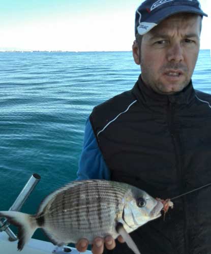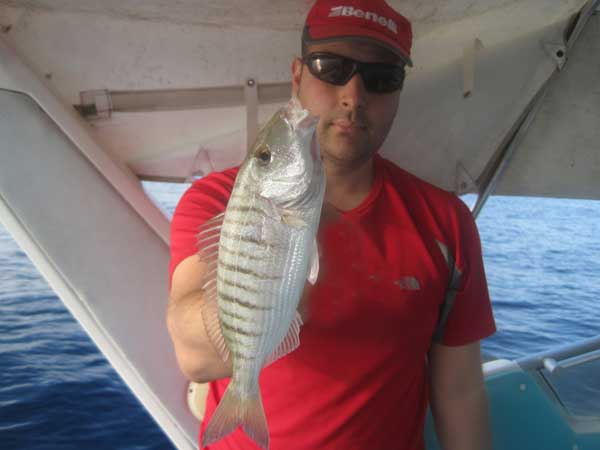 Arriba el patrón con un doblete de dorada y sorela. Vea el listado característico de este pez, motivado por el stress, recién salido de la agua. Pulse para ampliar |