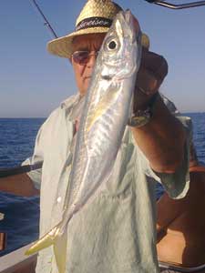 | Los jureles tenían un tamaño entre 30 y 35 cm y un peso de unos 200 a 300 gr. (Pulse aquí) pero dieron buen juego hasta eso de las 10,30, por lo que eso, unido a la calma el sol y el calor, nos empujó al embarcadero |