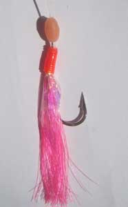 | Arriba y a la izquierda y centro, señuelo con pluma y perla fluorescente, que colocado por encima de los anzuelos cebados, nos proporcionó un monton de picadas y pescado .El que muestro procede de un Mitraflash de RAGOT |