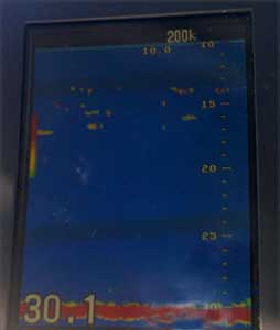 Para localizarlos es fundamental el uso de una buena sonda y saber interpretar sus imágenes. Nosotros los encontramos, en esta época, en sondas de hasta 30 metros, de ordinario en o cerca de fondos rocosos, aunque también , como en esta ocasión, en fondos de arena o fango . Bajo, unas cuantas imagenes ese día de pesca |